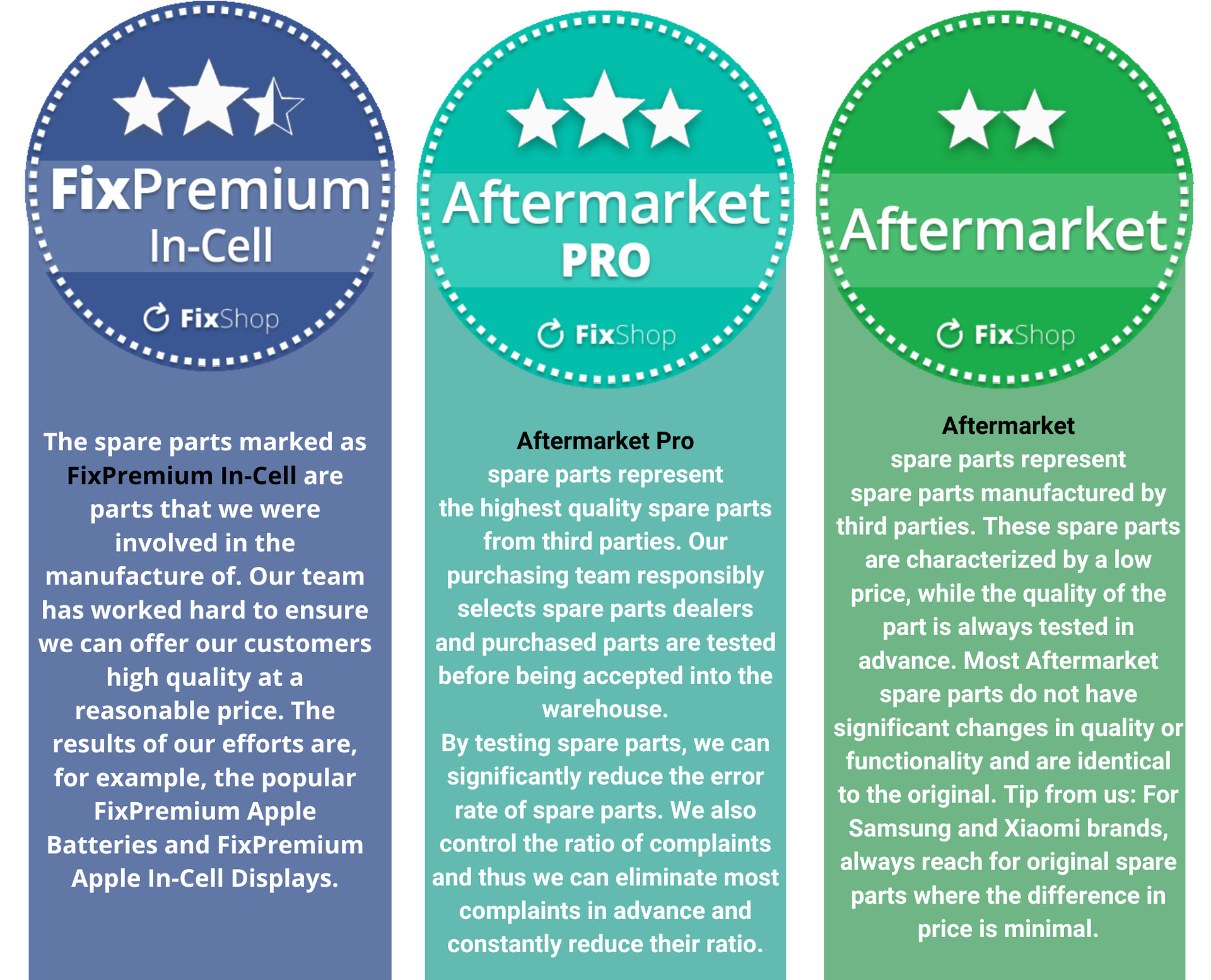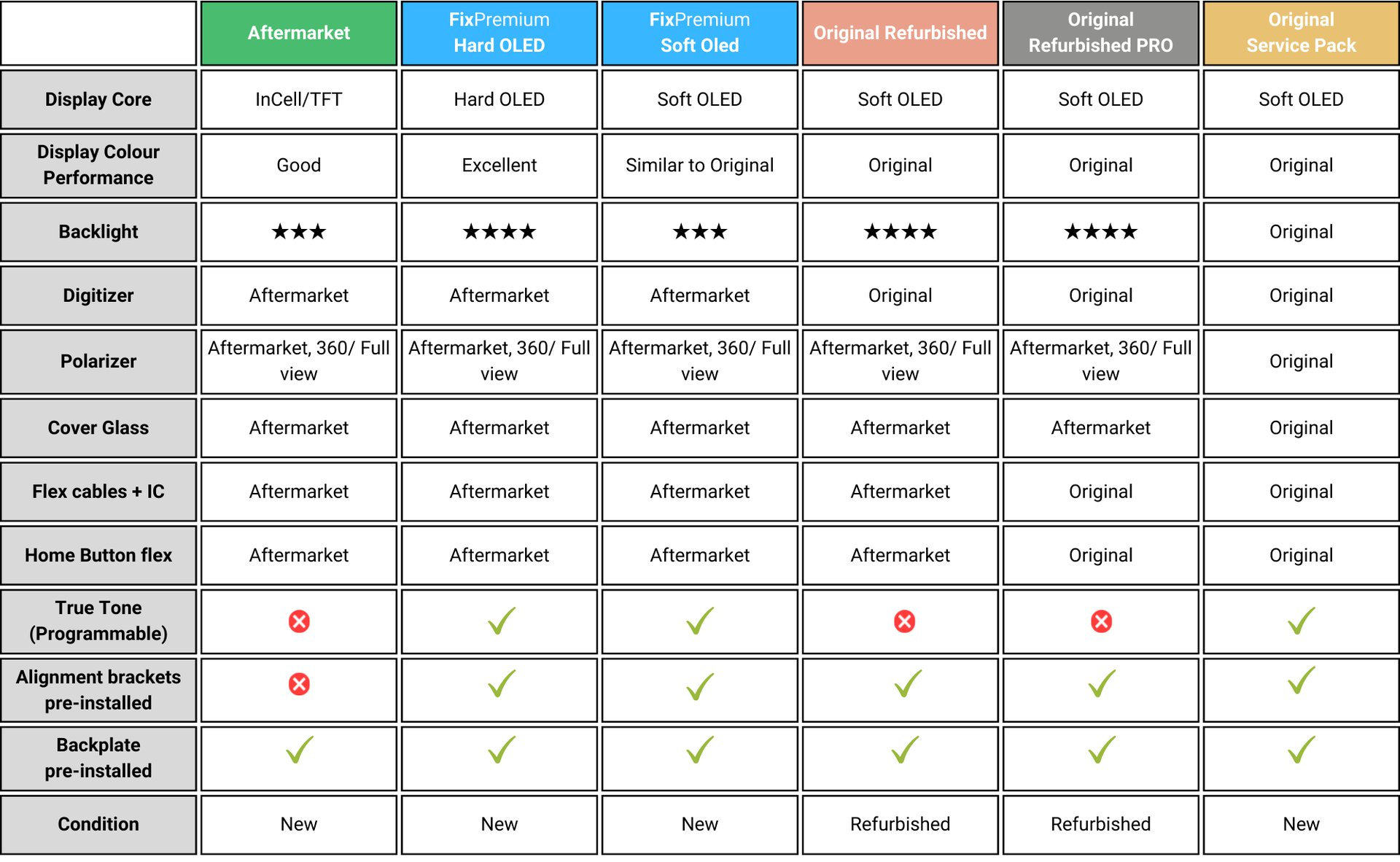 For Aftermarket spare parts, we work with 2 groups of category divisions: FixPremium In-Cell, Aftermarket Pro and Aftermarket